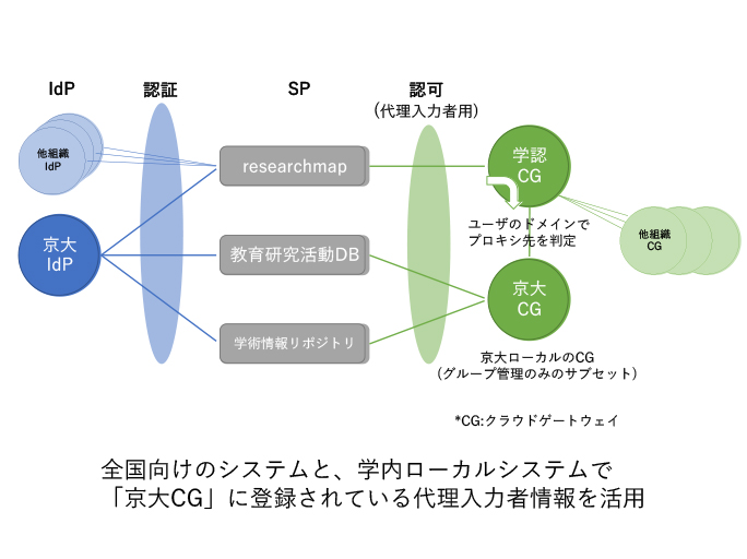 古村氏:運用開始当初は、「researchmap(V1)」「京都大学教育研究活動データベース」の2システムで、代理入力者情報の共有を行いました。その後、京都大学附属図書館の管理する「京都大学学術情報リポジトリ」にも共有先を広めました。環境構築面での工夫としては、NIIのクラウドゲートウェイとは別に学内ローカルのクラウドゲートウェイを用意した点が挙げられます。技術的には学認クラウドゲートウェイサービスだけで認可を行うこともできますが、researchmapのような全国向けのシステムだけでなく、学内のローカルシステムからもグループ情報を参照したかった。また、本学の代理入力者情報は学内で閉じた方が良いだろうとの議論もあり、グループ管理機能だけのサブセットを導入することにしたのです。
